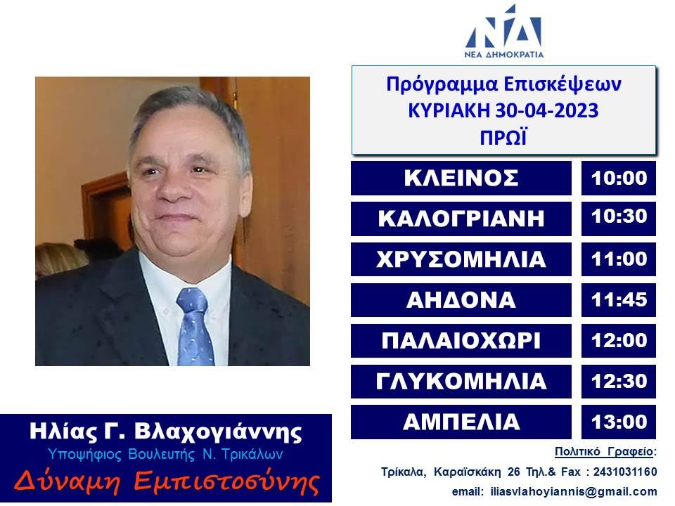 Τρίκαλα Η περιοδεία Βλαχογιάννη την Κυριακή σε Αηδόνα, Γλυκομηλιά και Καλογριανή Newsroom29/04/2023 Less than a minute Facebook X Διαβάστε επίσης... Η Κομπανία Βέρδη αναμένεται να «ανάψει» το γλέντι στον Παλαιόπυργο την Κυριακή 21/12 01/12/2025 Με 62 συλλόγους η Ελλάδα χορεύει στις “Γιορτές Παράδοσης 2025-26“ του Μύλου των Ξωτικών 01/12/2025 Newsroom29/04/2023 Less than a minute Facebook X Share Facebook X Pinterest WhatsApp Viber