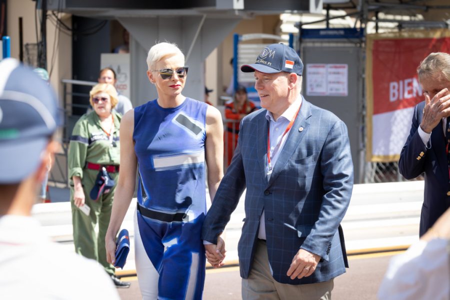 H πριγκίπισσα Σαρλίν με φόρεμα πάνω από παντελόνι στους αγώνες Γκραν Πρι