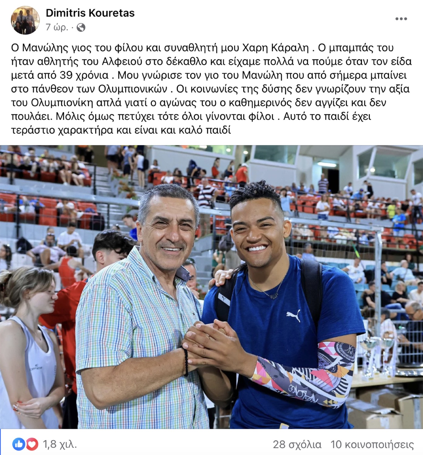 «Ο Μανώλης γιος του φίλου και συναθλητή μου Χαρη Κάραλη  Ο μπαμπάς του ήταν αθλητής του Αλφειού στο δέκαθλο και είχαμε πολλά να πούμε όταν τον είδα μετά από 39 χρόνια. Μου γνώρισε τον γιο του Μανώλη που από σήμερα μπαίνει στο πάνθεον των Ολυμπιονικών. Οι κοινωνίες της δύσης δεν γνωρίζουν την αξία του Ολυμπιονίκη απλά γιατί ο αγώνας του ο καθημερινός δεν αγγίζει και δεν πουλάει. Μόλις όμως πετύχει τότε όλοι γίνονται φίλοι. Αυτό το παιδί έχει τεράστιο χαρακτήρα και είναι και καλό παιδί».