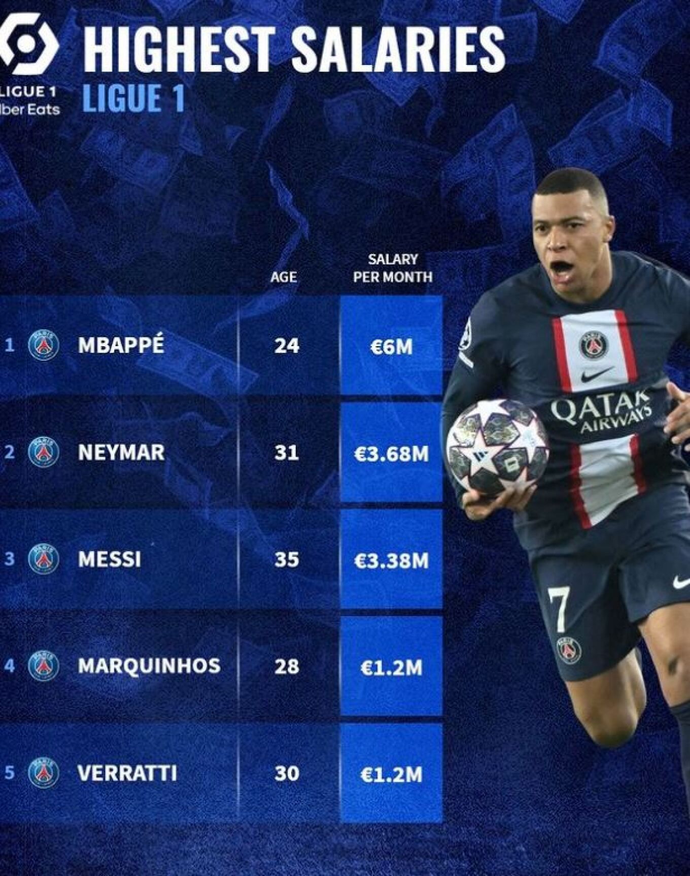 Στην κορυφή του σχετικού καταλόγου, βρίσκεται ο Κιλιάν Εμπαπέ, ο οποίος για να μην «μετακομίσει» στην Ρεάλ Μαδρίτης, υπέγραψε συμβόλαιο με μηνιαίες αποδοχές ύψους έξι εκατομμυρίων ευρώ, ενώ ακολουθούν ο Νεϊμάρ με 3,675 εκατομμύρια ευρώ και ο Λιονέλ Μέσι με 3,375 εκατομμύρια ευρώ.