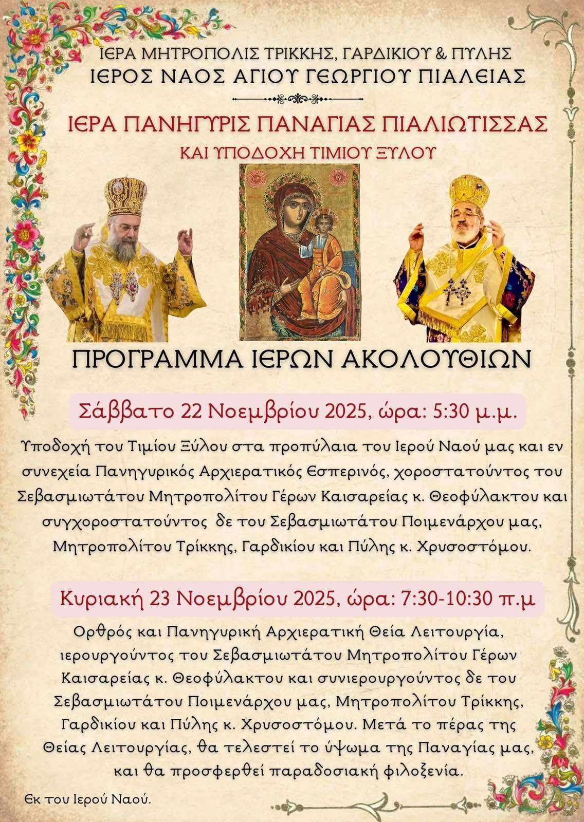 και θα συγχοροστατήσει ο Σεβασμιώτατος Ποιμενάρχης μας, Μητροπολίτης Τρίκκης, Γαρδικίου και Πύλης κ. Χρυσόστομος. Κυριακή 23 Νοεμβρίου 2025, ώρα 7:30–10:30 π.μ.