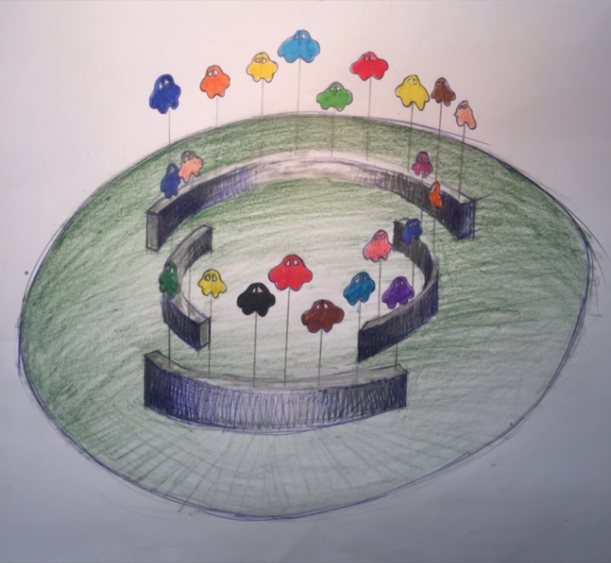 Σύμφωνα με πληροφορίες του onlarissa.gr, ο τίτλος του έργου θα είναι «…Γύρω – Γύρω Όλοι…» και θα αποτελείται από 40 μεταλλικά αυτοκίνητα πάνω σε μεταλλικές στήλες τα οποία θα έχουν διαφορετικά χρώματα. Τα έργα θα έχον επίσης διαφορετικό ύψος έτσι ώστε να δημιουργείται μία επιπλέον κίνηση στο έργο. Θα τοποθετηθούν σε τέσσερα ημικύκλια από μπετόν.