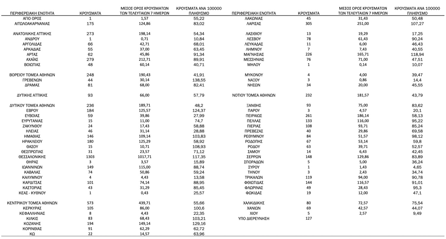 Με βάση τα επιβεβαιωμένα κρούσματα των τελευταίων 7 ημερών, 113 θεωρούνται σχετιζόμενα με ταξίδι από το εξωτερικό και 3.204 είναι σχετιζόμενα με ήδη γνωστό κρούσμα.