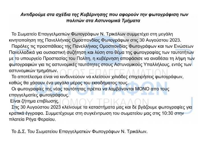 Τρίκαλα Κλείνουν τα Φωτογραφεία στα Τρίκαλα την Τετάρτη 30/8 ! Αντιδρούν στα σχέδια της Κυβέρνησης για φωτογράφηση ταυτοτήτων στα Α.Τμήματα Αλεξάνδρα Τάμπου29/08/2023 Less than a minute Facebook X Διαβάστε επίσης... Η Κομπανία Βέρδη αναμένεται να «ανάψει» το γλέντι στον Παλαιόπυργο την Κυριακή 21/12 01/12/2025 Με 62 συλλόγους η Ελλάδα χορεύει στις “Γιορτές Παράδοσης 2025-26“ του Μύλου των Ξωτικών 01/12/2025 Αλεξάνδρα Τάμπου29/08/2023 Less than a minute Facebook X Share Facebook X Pinterest WhatsApp Viber