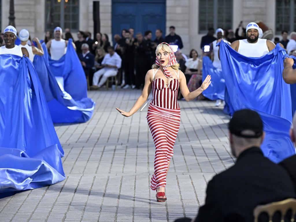 Σε ένα ξέφρενο πηγαινέλα που θύμιζε σκηνή των Folies Bergère, ποδηλάτες, χορευτές με κλακέτες, νεαροί Γάλλοι αθλητές και χορευτές ανακατεύτηκαν με μοντέλα-μούσες σαν την Debra Shaw και ινδάλματα της νεανικής ποπ κουλτούρας, όπως η Sabrina Carpenter.