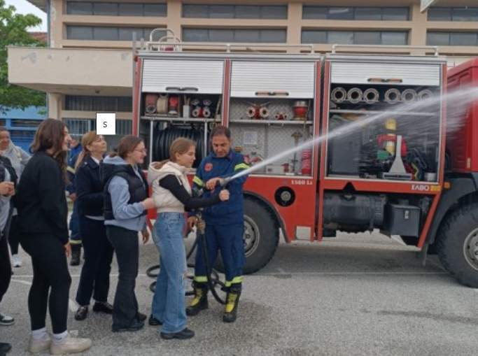 Ακολούθησε μια εντυπωσιακή επίδειξη πυρόσβεσης, κατά την οποία άναψαν φωτιά σε μεταλλικό κάδο και στη συνέχεια ακολουθήθηκε το πρωτόκολλο πυρόσβεσης. Επιπλέον, οι μαθητές/τριες είχαν τη δυνατότητα να δοκιμάσουν τη χρήση της πυροσβεστικής μάνικας και εντυπωσιάστηκαν με τη δύναμη εκτόξευσης του νερού, βιώνοντας έτσι από κοντά την πρόκληση και την ευθύνη του έργου των πυροσβεστών.