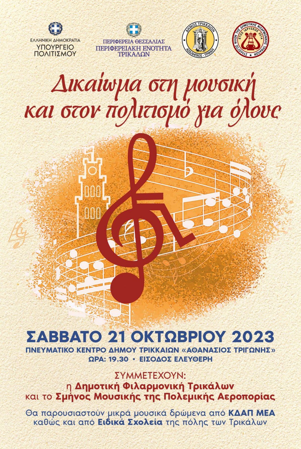 Μια μεγάλη μουσική εκδήλωση με τη συμμετοχή πλήθους μουσικών πραγματοποιείται για τα άτομα με αναπηρία στα Τρίκαλα. Ο Σύλλογος Φίλων της Δημοτικής Φιλαρμονικής Τρικάλων σε συνεργασία με την Περιφέρεια Θεσσαλίας και τον Δήμο Τρικκαίων διοργανώνουν το Σάββατο 21 Οκτωβρίου 2023 στις 19.30 στο Πνευματικό Κέντρο του Δήμου Τρικκαίων «Αθανάσιος Τριγώνης»,  την εκδήλωση με τίτλο «Δικαίωμα στη μουσική και στον πολιτισμό για όλους».