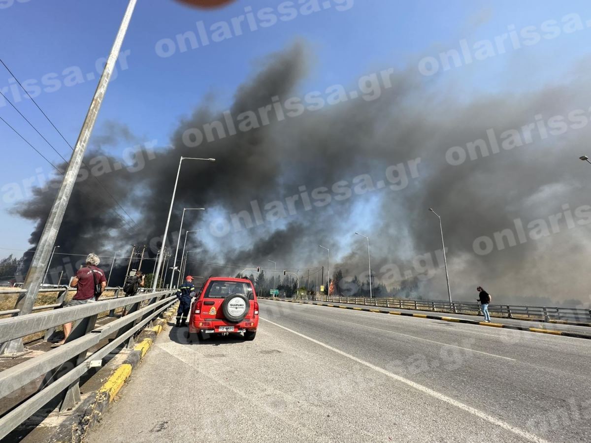 Μεγάλη φωτιά έκλεισε την εθνική οδό έξω από τη Λάρισα στον κόμβο του Πλατυκάμπου
