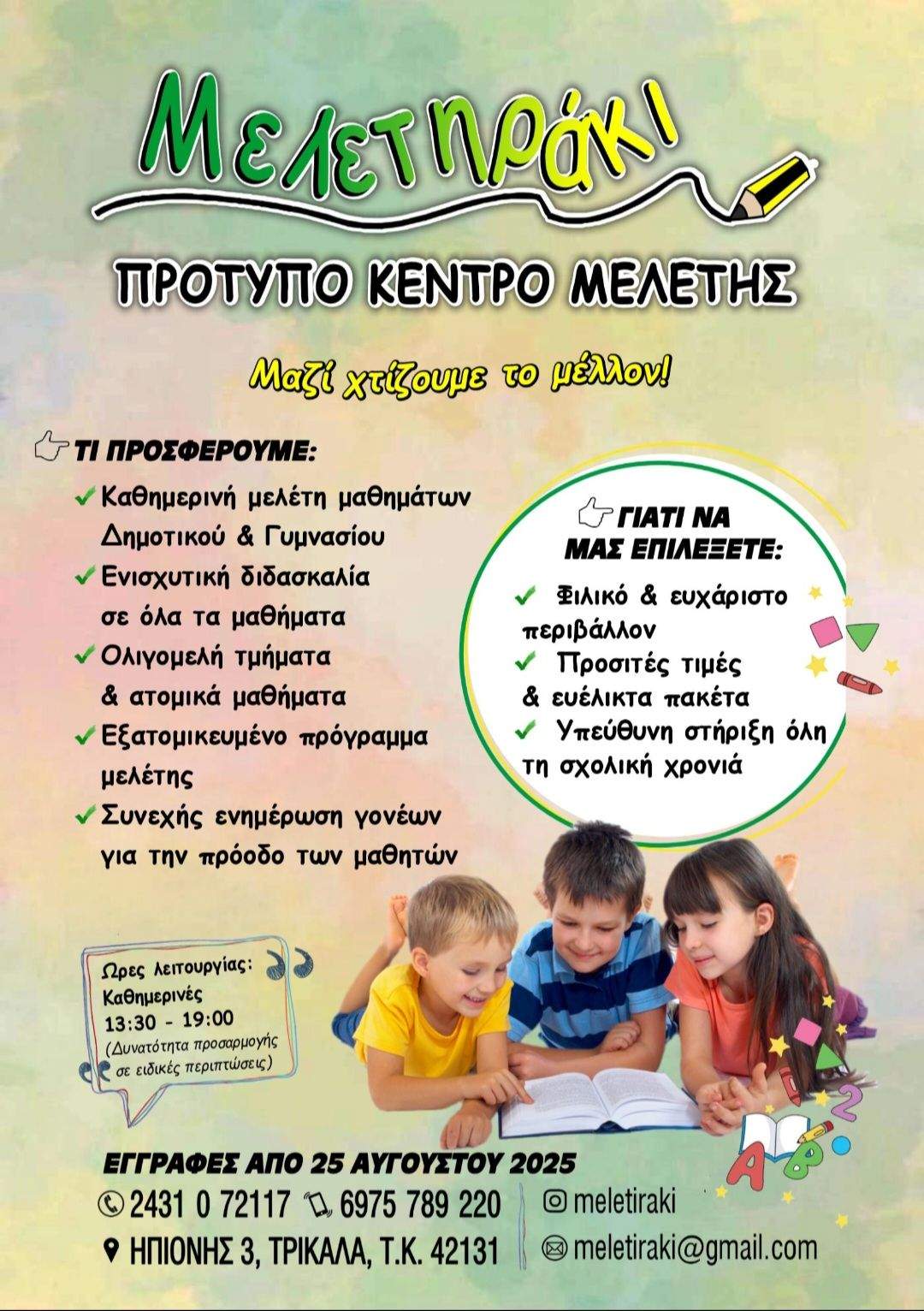 Ένα νέο εκπαιδευτικό στέκι έρχεται να στηρίξει τους μαθητές Δημοτικού και Γυμνασίου στα Τρίκαλα! Το «Μελετηράκι», με υπεύθυνη τη Δήμητρα Χρυσόμαλλου, ανοίγει τις πόρτες του προσφέροντας ένα ολοκληρωμένο πρόγραμμα καθημερινής μελέτης και ενισχυτικής διδασκαλίας, προσαρμοσμένο στις ανάγκες κάθε παιδιού.