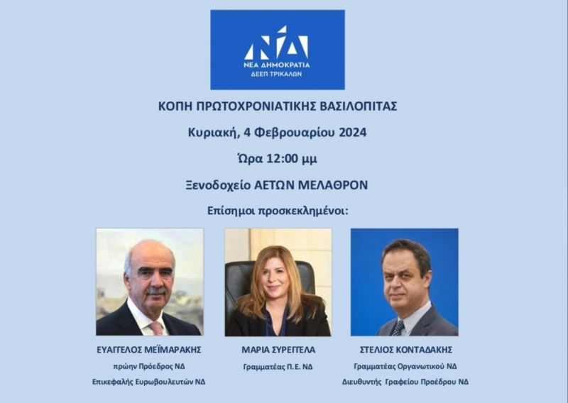 Την Κυριακή 4 Φεβρουαρίου , ώρα 12:00 μμ , στο Ξενοδοχείο ΑΕΤΩΝ ΜΕΛΑΘΡΟΝ θα πραγματοποιηθεί η κοπή Βασιλόπιτας της ΔΕΕΠ ΝΔ Τρικάλων. Επίσημοι προσκεκλημένοι θα είναι: Ο Ευάγγελος Μεϊμαράκης , πρώην Πρόεδρος ΝΔ και επικεφαλής των Ευρωβουλευτών της ΝΔ , η Μαρία Συρεγγέλα , Γραμματέας Π.Ε. ΝΔ και ο Στυλιανός Κονταδάκης, Γραμματέας Οργανωτικού και Διευθυντής Γραφείου Προέδρου ΝΔ.