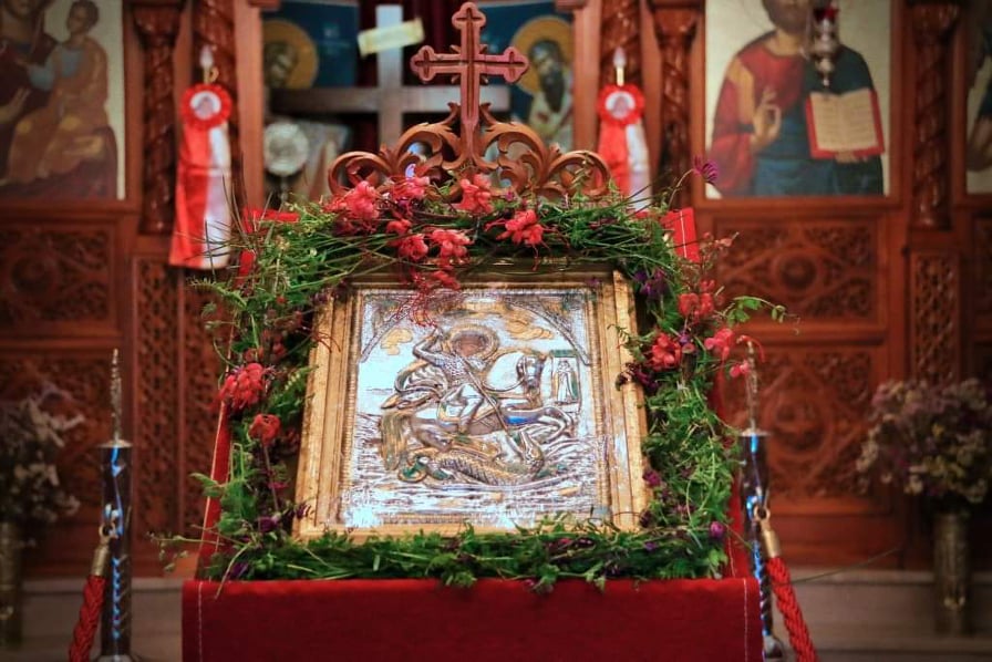 Τον προστάτη της Άγιο Γεώργιο γιορτάζει σήμερα η εκκλησία μας και μπορεί οι περιορισμοί να έχουν μετατρέψει σε “κεκλεισμένων των θυρών λειτουργίες” τις θρησκευτικές εκδηλώσεις, ωστόσο η εικόνα του Αγίου Γεωργίου έφτασε και φέτος με άλογο και καβαλάρη από το εκκλησάκι στο Σκαφιδάκι, στον Ιερό Ναό του Αγίου Θωμά.Την εικόνα μετέφερε και παρέδωσε το απόγευμα της Τετάρτης στον Ιερέα ο επίτροπος Γιώργος Σάλιαρης ώστε να παρευρίσκεται στον Όρθρο και τη Θεία Λειτουργία και στη συνέχεια να επιστρέψει και πάλι στο Σκαφιδάκι. Η μεταφορά της εικόνας του Τροπαιοφόρου Αγίου με καβαλάρηδες στον Άγιο Θωμά έχει αναβιώσει με μεγάλη επιτυχία τα τελευταία χρόνια και ευχή όλων είναι το έθιμο να πραγματοποιηθεί του χρόνου με όλους τους πιστούς