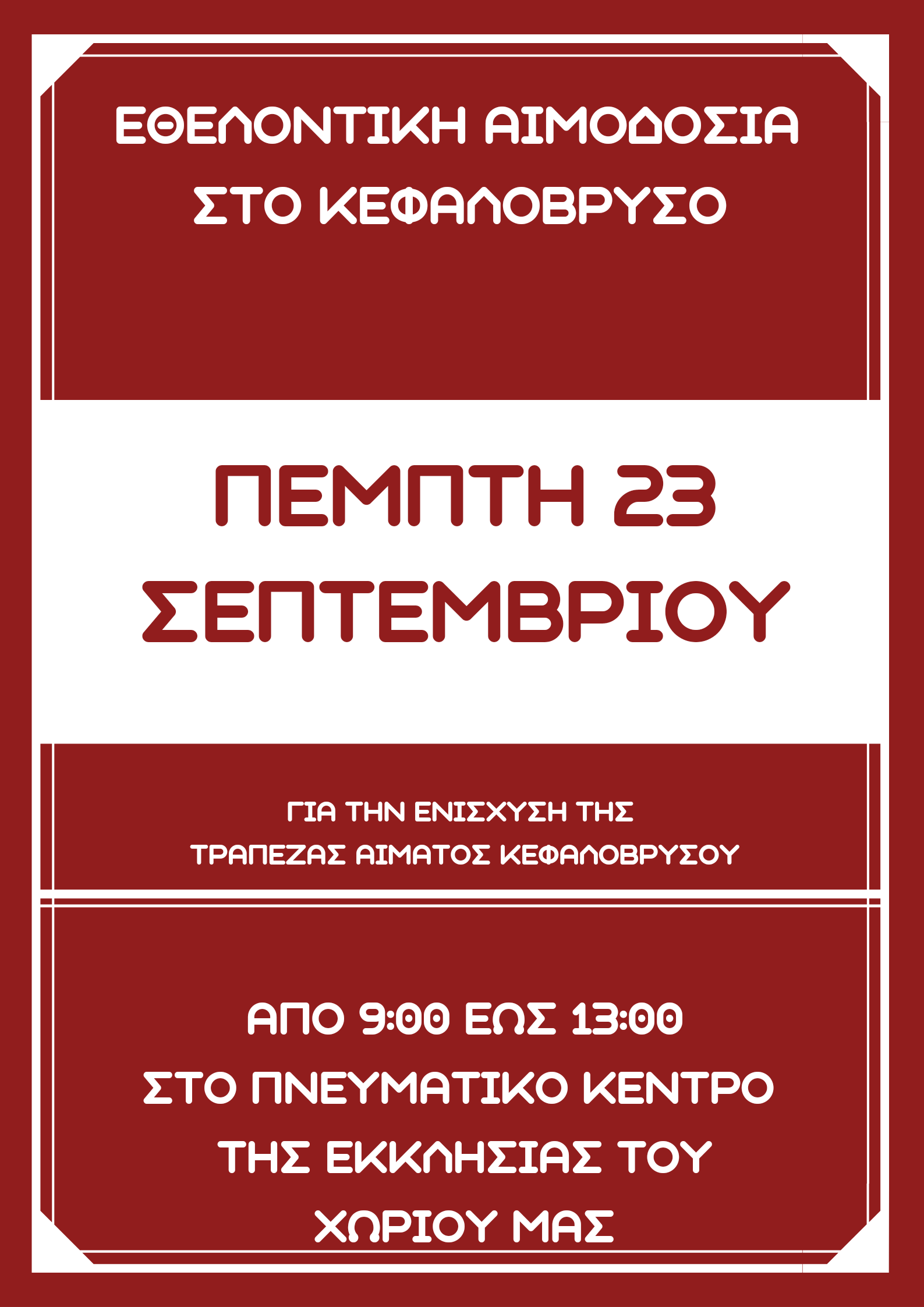 Η αιμοδοσία θα λάβει χώρα στον Άγιο Γεώργιο Κεφαλοβρύσου, την Πέμπτη 23 Σεπτεμβρίου. Το ωράριο υποδοχής των εθελοντών αιμοδοτών είναι 09:00 έως 13:00, με την τήρηση όλων των υγειονομικών πρωτοκόλλων.