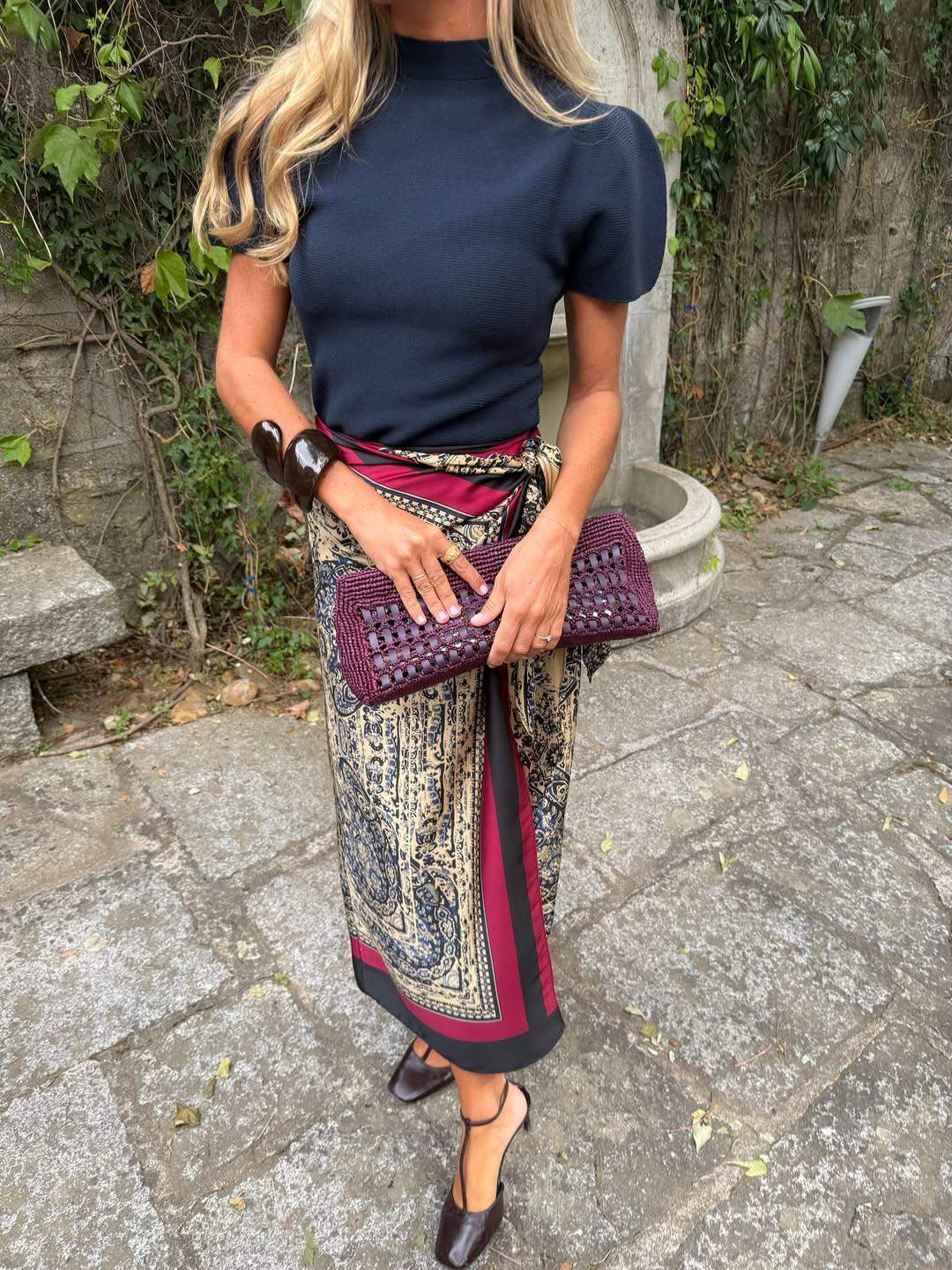 Το κεντρικό κομμάτι του look της Claudia είναι μια εμπριμέ φούστα, που ενσωματώνει μερικές από τις βασικές τάσεις του φθινοπώρου: