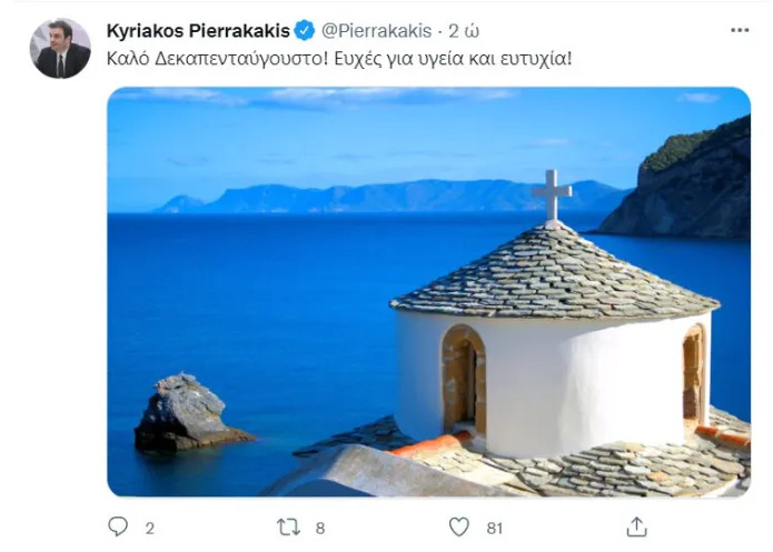 Τις ευχές του για τον 15αύγουστο έστειλε μέσα από το Twitter ο Υπουργός Ψηφιακής Διακυβέρνησης Κυριάκος Πιερρακάκης έχοντας φόντο, όπως δημοσίευσε το skiathoslife.gr, την Παναγίτσα του Πύργου Σκοπέλου. Άγνωστο παραμένει βέβαια αν βρίσκεται στο νησί ή απλά έκανε την ανάρτηση με μια φωτογραφία που πραγματικά είναι εκπληκτική από το νησί των Β. Σποράδων.