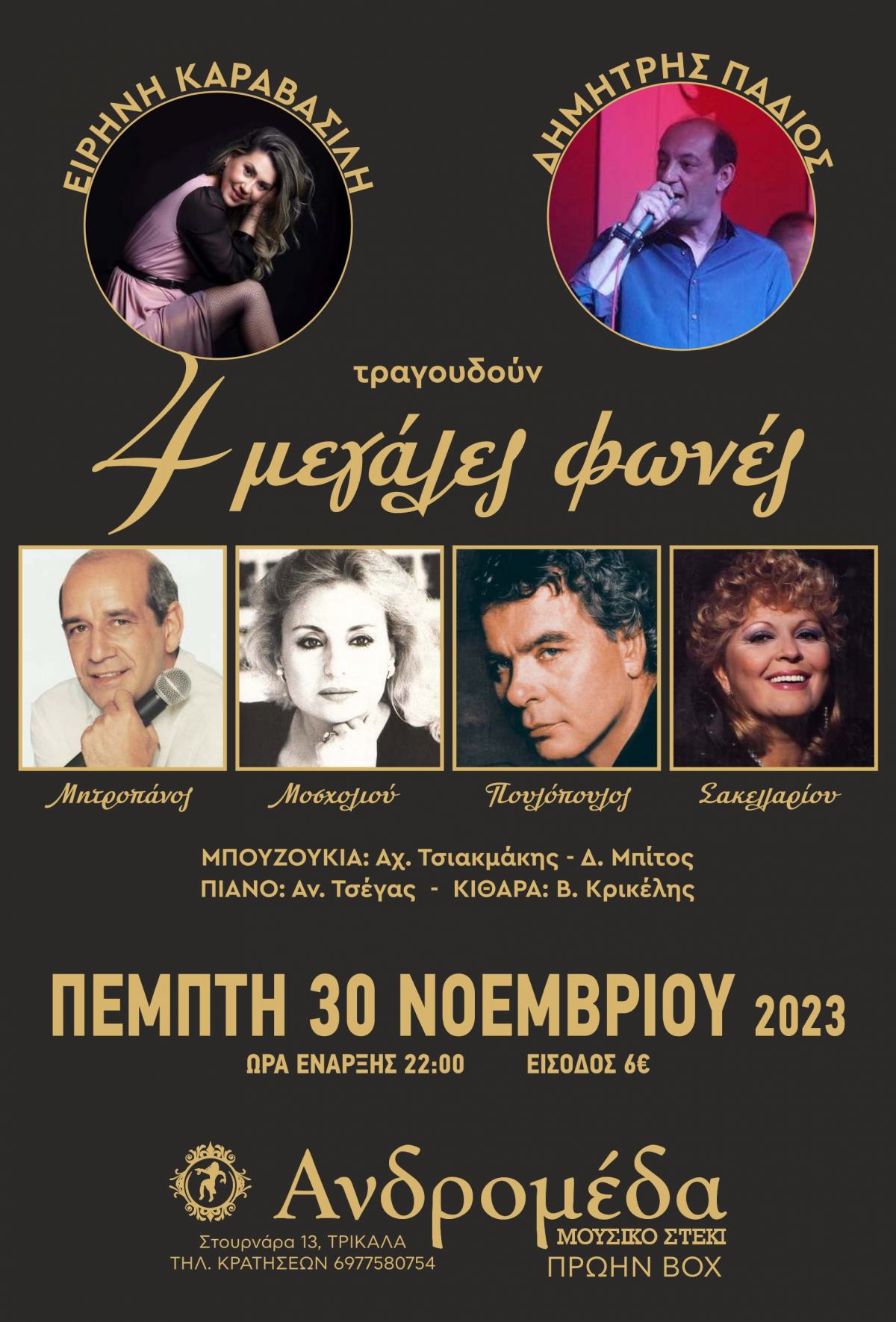 ΜΗΤΡΟΠΑΝΟΣ – ΜΟΣΧΟΛΙΟΥ – ΠΟΥΛΟΠΟΥΛΟΣ  -ΣΑΚΕΛΛΑΡΙΟΥ Πέμπτη 30 Νοεμβρίου 2023 Ώρα έναρξης: 22.00 τιμή εισόδου: 6 ευρώ ΑΝΔΡΟΜΕΔΑ (πρώην μουσικό στέκι BOX) Στουρνάρα 13 Τρίκαλα Τηλέφωνο κρατήσεων: 6977580754