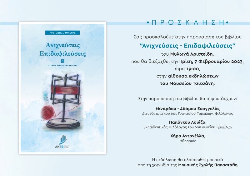 Το βιβλίο παρουσιάζουν την Πέμπτη, 7 Φεβρουαρίου 2023 στις 7.00 μ.μ στο Μουσείο Τσιτσάνη, η κ. Ευαγγελία Μινάρδου, Διευθύντρια του 6ου Γυμνασίου Τρικάλων, η κ. Λουΐζα Παπάντου, εκπαιδευτικός, φιλόλογος στο 6ο ΓΕΛ,  η κ. Αντονέλλα Χήρα, ηθοποιός, ενώ η εκδήλωση θα πλαισιωθεί χορωδιακά από τη Μουσική Σχολή Παπαστάθη.