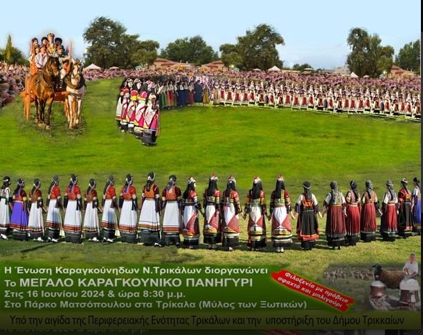Η Ένωση Καραγκούνηδων Ν. Τρικάλων ετοιμάζεται για την κεντρική της εκδήλωση, Το Μεγάλο Καραγκούνικο Πανηγύρι, που θα πραγματοποιηθεί αύριο Κυριακή 16 Ιουνίου 2024, ώρα 20:30, στο πάρκο του Μύλου Ματσόπουλου, υπό την αιγίδα της Περιφέρειας Θεσσαλίας-Περιφερειακής Ενότητας Τρικάλων και την υποστήριξη του Δήμου Τρικκαίων.