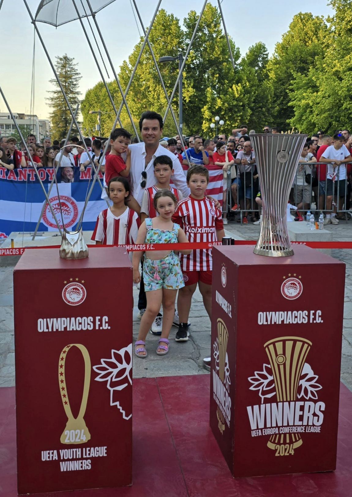 Μια ιστορική φωτογραφία, ειδικά για τους νεότερους της οικογενείας μας (τα παιδάκια μου και τα ανηψάκια μου). Μακάρι τα παιδιά να ζήσουν και άλλες τέτοιες στιγμές, ωστόσο πάντα θα έχουν αυτή τη φωτογραφία για να θυμούνται πως.. τότε, το 2024, ήρθαν κοντά με τα ευρωπαϊκά τρόπαια του Ολυμπιακού μας. Κύπελλο Conference League και κύπελλο Champions league των νέων. Μπράβο στον Ολυμπιακό μας, που με τη μεταφορά των τροπαίων σε κάθε νομό, δίνει την δυνατότητα σε μικρούς και μεγάλους φίλους, να έρθουν κοντά με την ιστορία του.