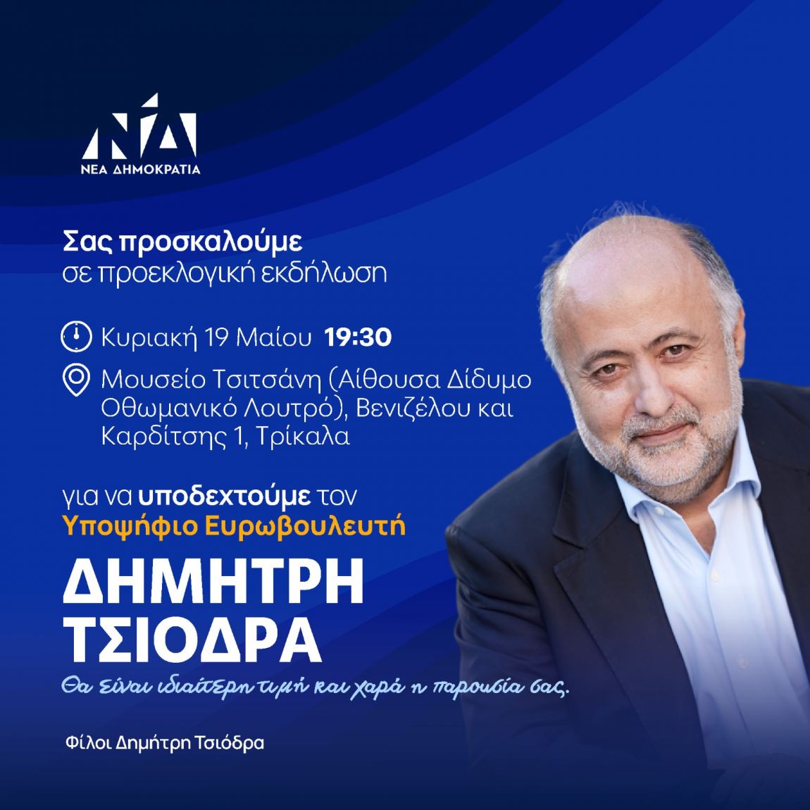 Ομιλία του υποψήφιου Ευρωβουλευτή της Νέας Δημοκρατίας Δημήτρη Τσιόδρα στις 19 Μαΐου στα Τρίκαλα