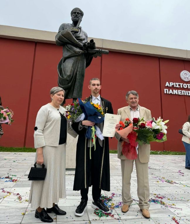 Ο νεαρός φαρμακοποιός, γεμάτος χαρά και ικανοποίηση, παρέλαβε το πτυχίο του στη Θεσσαλονίκη, σηματοδοτώντας το τέλος μιας απαιτητικής αλλά όμορφης φοιτητικής διαδρομής και την αρχή μιας νέας προοπτικής. Μαζί του, οι γονείς του, Δημήτρης και Ελένη, που στάθηκαν βράχος δίπλα του σε όλη τη διαδρομή, δεν έκρυβαν τη συγκίνησή τους, βλέποντας τον κόπο ετών να δικαιώνεται.