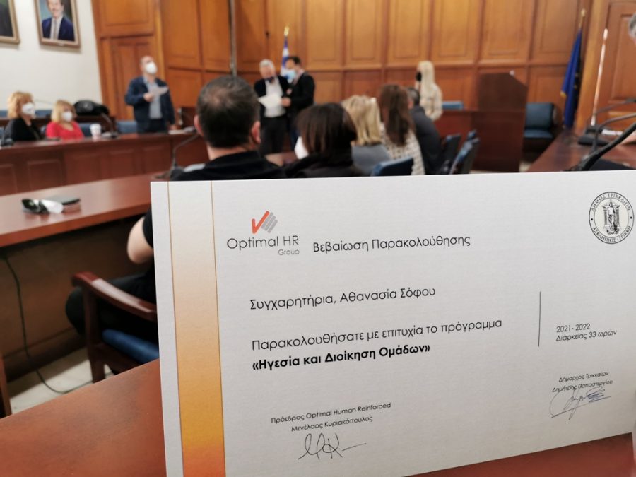 Την πεποίθηση πως η βελτίωση της εξυπηρέτησης των πολιτών επιτυγχάνεται και μέσω της συνεχούς επιμόρφωσης – εκπαίδευσης των υπαλλήλων, σηματοδότησε η «αποφοίτηση» υπαλλήλων του Δήμου Τρικκαίων από σχετικό πρόγραμμα. Επρόκειτο για το πρόγραμμα επιμόρφωσης και εκπαίδευσης στελεχών με τίτλο «Ηγεσία & Διοίκηση Ομάδων», με την απονομή των σχετικών βεβαιώσεων παρακολούθησης να πραγματοποιείται τη Δευτέρα 9 Μαΐου 2022 στο Δημαρχείο Τρικκαίων, Δημήτρη Παπαστεργίου.
