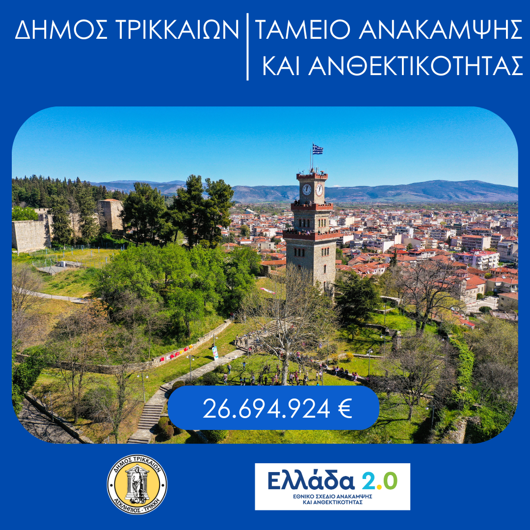 Ταμείο Ανάκαμψης και Ανθεκτικότητας εντάσσεται ο Δήμος Τρικκαίων. Βάσει των στοιχείων
