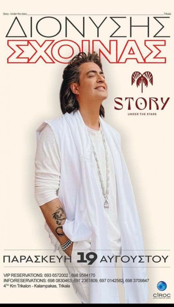 Την Παρασκευή 19 Αυγούστου έρχεται στο Story under the stars, ο αγαπημένος Διονύσης Σχοινάς , σε ένα μοναδικό live για τη Θεσσαλία. Κάντε κράτηση τώρα στο 6980830463, και ζήστε από κοντά τις μοναδικές επιτυχίες του .Στο 4οχλμ.Τρικαλων – Καλαμπάκας