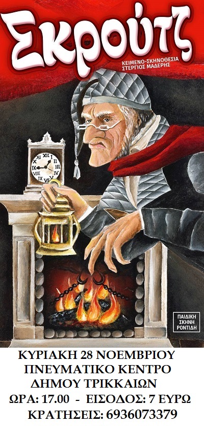 Η Παιδική Σκηνή Ροντίδη παρουσιάζει την παράσταση «Σκρουτζ» στα Τρίκαλα. Η παράσταση θα δοθεί στο Πνευματικό Κέντρο Δήμου Τρικκαίων «Αθανάσιος Τριγώνης» την Κυριακή 28 Νοεμβρίου στις 17.00. Γενική είσοδος 7 ευρώ.