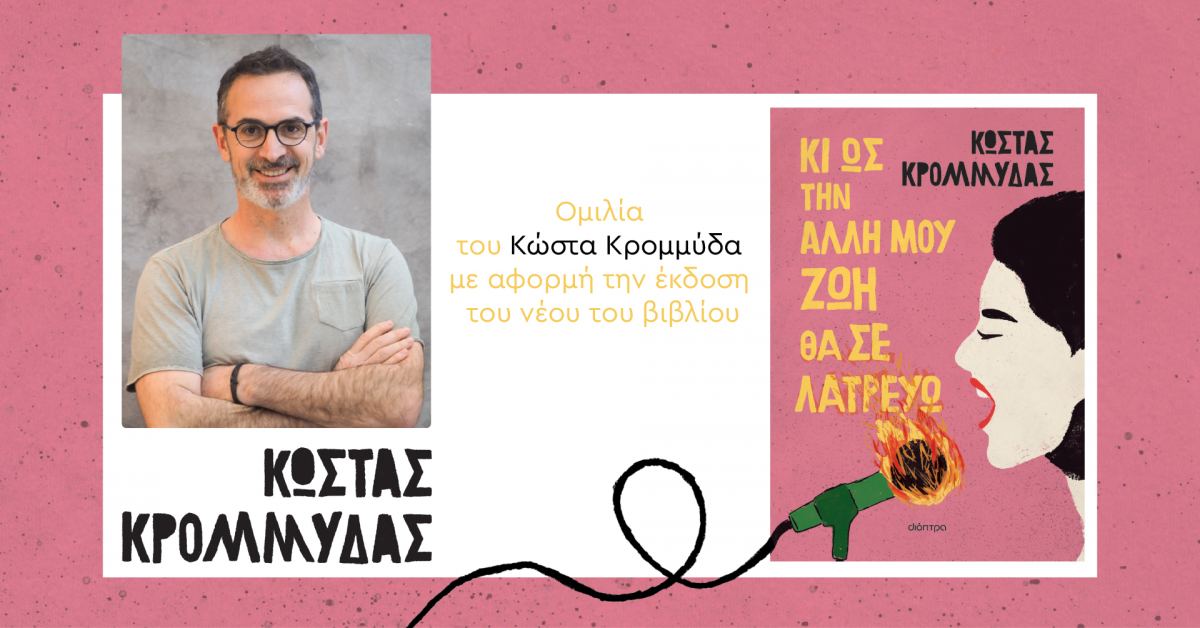 Οι Εκδόσεις Διόπτρα και το βιβλιοπωλείο Παπαγιάννη σας προσκαλούν στην ομιλία του Κώστα Κρομμύδα με αφορμή το νέο του βιβλίο «Κι ως την άλλη μου ζωή θα σε λατρεύω» την Πέμπτη 11 Μάϊου στις 20.00 στο Μουσείο Τσιτσάνη, Βενιζέλου και Καρδίτσης 1. Ο συγγραφέας θα συνομιλήσει με την Πένυ Κοντολάτη, συμβολαιογράφο. Την εκδήλωση θα πλαισιώσουν μουσικά η Κατερίνα Μπαρμπαρούση (τραγούδι) και ο Βασίλης Σαμαράς (κιθάρα).