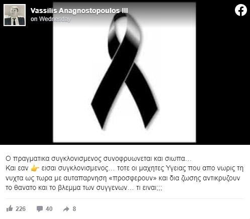 Εξού και η έκρηξή του: «Ο πραγματικά συγκλονισμένος συνοφρυώνεται και σιωπά… Και εαν εισαι συγκλονισμένος… τοτε οι μαχητές Υγείας που απο νωρίς τη νύχτα ως τώρα με αυταπάρνηση «προσφέρουν» και δια ζώσης αντικρύζουν το θάνατο και το βλέμμα των συγγενών… τι είναι;;;».