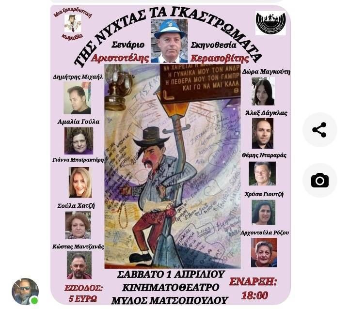 Ο σύλλογος φίλων τέχνης και θεάτρου “ΠΟΛΥΜΥΘΟΝ”σας παρουσιάζει την ξεχωριστή κωμωδία του εκπληκτικού και ταλαντούχου Αριστοτέλη Κερασοβίτη που θα συζητηθεί. Ευχάριστα μηνύματα ηθικά, κοινωνικά με μαθήματα ζωής και ψυχής που καθηλώνουν τον θεατή από το πρώτο λεπτό έως το τελευταίο. Μην λείψει κανείς, η παρουσία σας θα μας χαροποιήσει ιδιαίτερα, τα φιλιά μου και την εκτίμησή μου σε όλους!