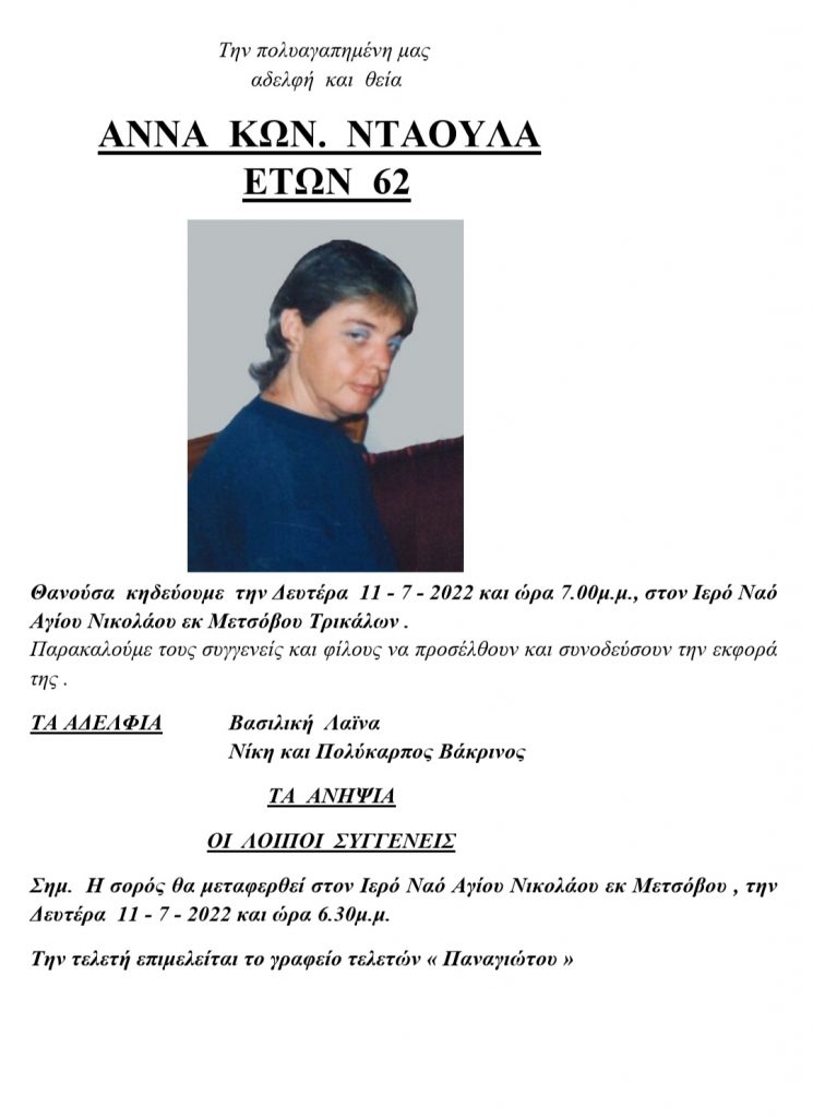 Τρίκαλα Πέθανε η Άννα Νταούλα Αλεξάνδρα Τάμπου10/07/2022 Less than a minute Facebook X Διαβάστε επίσης... Η Κομπανία Βέρδη αναμένεται να «ανάψει» το γλέντι στον Παλαιόπυργο την Κυριακή 21/12 01/12/2025 Με 62 συλλόγους η Ελλάδα χορεύει στις “Γιορτές Παράδοσης 2025-26“ του Μύλου των Ξωτικών 01/12/2025 Αλεξάνδρα Τάμπου10/07/2022 Less than a minute Facebook X Share Facebook X Pinterest WhatsApp Viber
