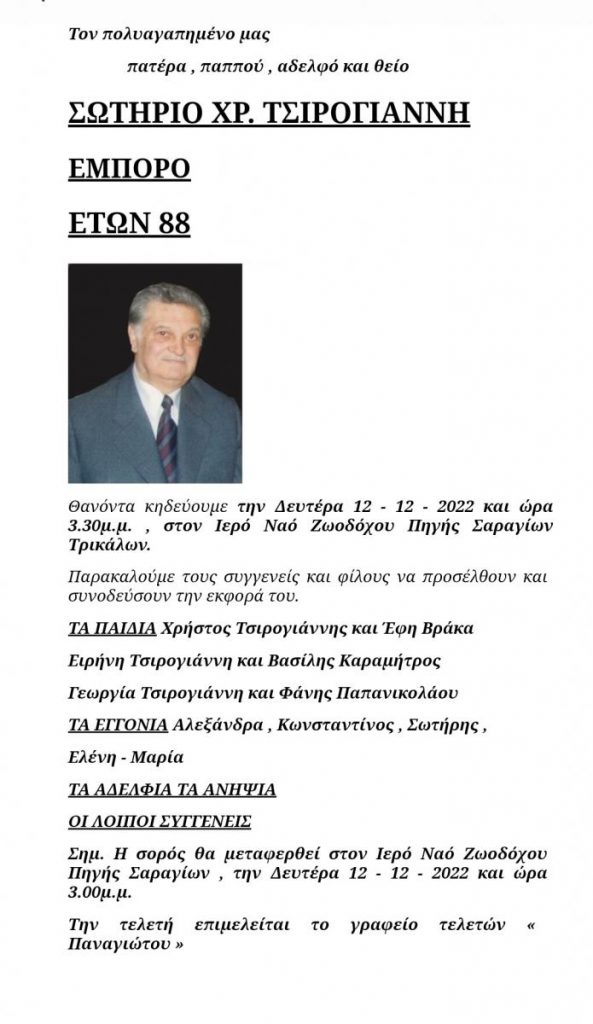 Πέθανε ο συντ/χος έμπορος Σωτήρης Τσιρογιάννης