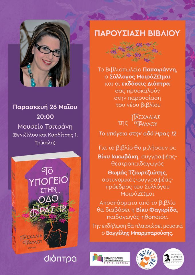 Το Βιβλιοπωλείο Παπαγιάννη, ο Σύλλογος ΜοιράΖΩμαι και οι εκδόσεις Διόπτρα σας προσκαλούν στην παρουσίαση του νέου βιβλίου της ΠΑΣΧΑΛΙΑΣ ΤΡΑΥΛΟΥ ΤΟ ΥΠΟΓΕΙΟ ΣΤΗΝ ΟΔΟ ΗΡΑΣ 12