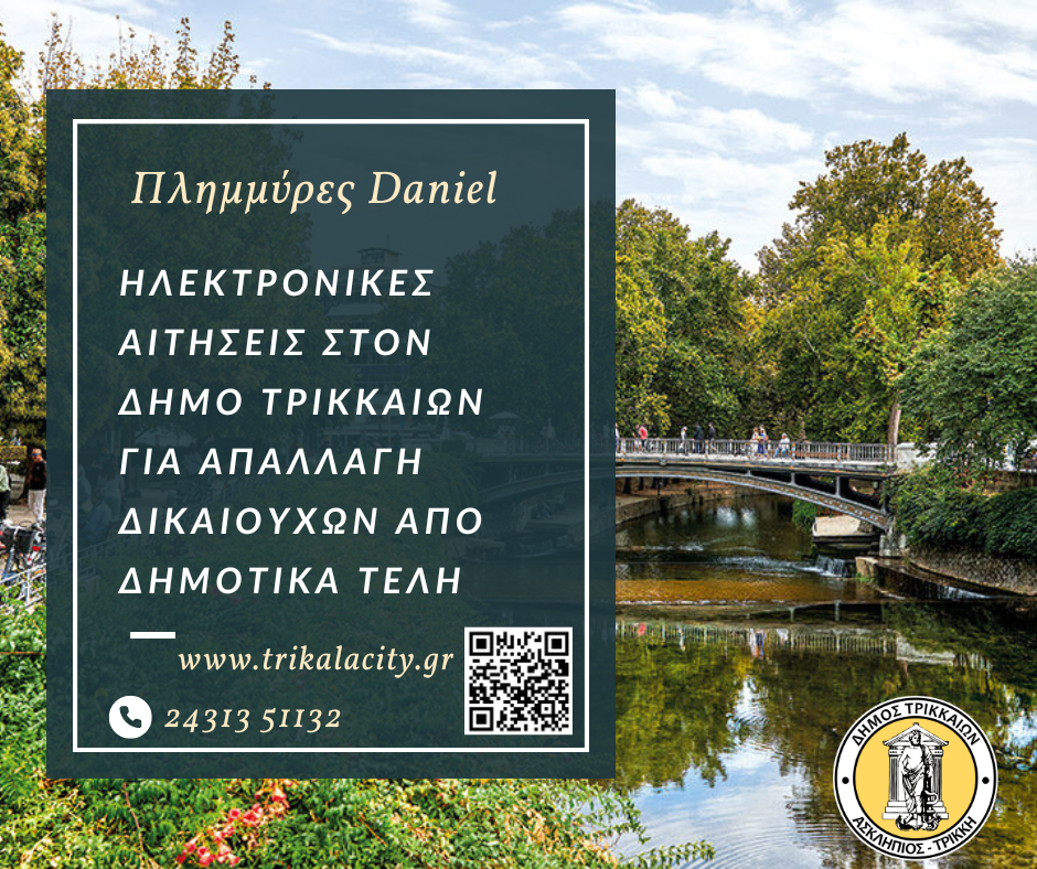 Ο Δήμος Τρικκαίων ανακοινώνει ότι ξεκινάει η διαδικασία υποβολής αιτήσεων για την απαλλαγή από Δημοτικά Τέλη, Δημοτικό Φόρο και ΤΑΠ, από δικαιούχους, των οποίων το ακίνητο υπέστη ζημιές λόγω της κακοκαιρίας Daniel. Πρόκειται για εφαρμογή των σχετικών αποφάσεων του Δημοτικού Συμβουλίου Τρικκαίων, με στόχο την ελάφρυνση των πολιτών. Προϋπόθεση είναι, να έχει πραγματοποιηθεί αυτοψία από τα συνεργεία ελέγχου.
