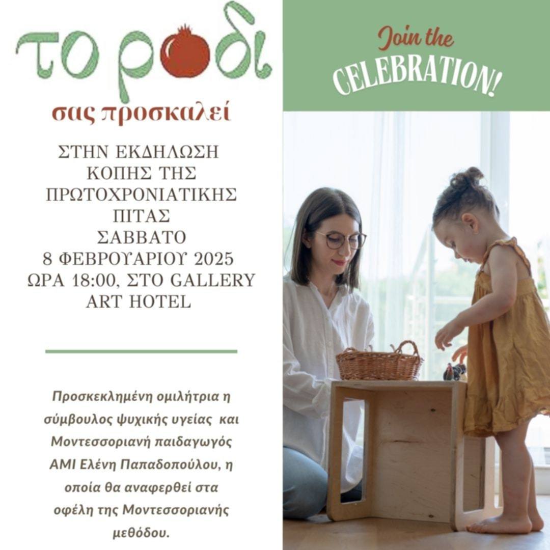 Ο Παιδικός Σταθμός “Το Ρόδι” σας προσκαλεί στην εκδήλωση κοπής της πρωτοχρονιάτικης πίτας, το Σάββατο 8 Φεβρουαρίου 2025 και ώρα 18:00, στο Gallery Art Hotel. Την εκδήλωση θα τιμήσει με την παρουσία της ως προσκεκλημένη ομιλήτρια η πιστοποιημένη Μοντεσσοριανή παιδαγωγός, Ελένη Παπαδοπούλου, η οποία θα μας μιλήσει για θέματα που αφορούν τη σύγχρονη εκπαίδευση και ανάπτυξη των παιδιών. Η παρουσία σας θα μας τιμήσει ιδιαίτερα!