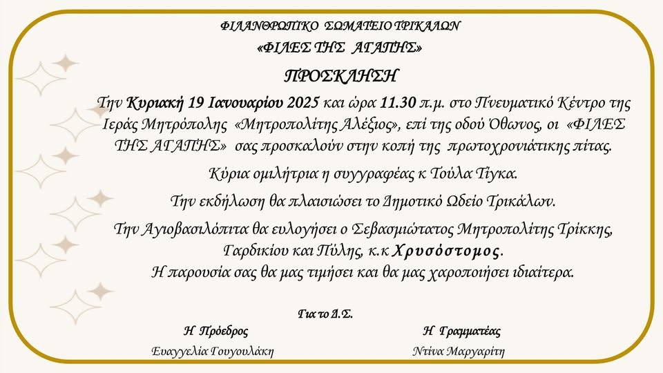 Σας καλούμε στη κοπή της πρωτοχρονιάτικης πίτας του σωματείου Φίλες της Αγάπης την Κυριακή 19 Ιανουαρίου στις 11.30 και σας περιμένουμε στο Πνευματικό Κέντρο της Μητρόπολης Τρίκκης.