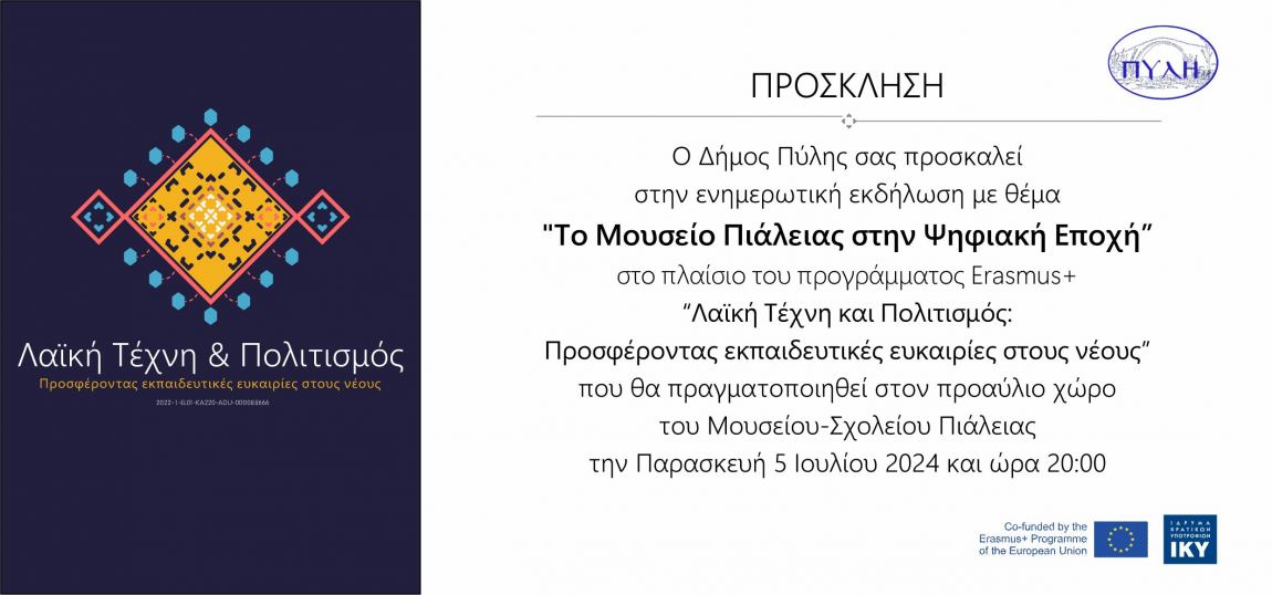 Ο Δήμος Πύλης σας προσκαλεί στην ενημερωτική εκδήλωση με θέμα «Το Μουσείο Πιάλειας στην Ψηφιακή Εποχή», που θα πραγματοποιηθεί την Παρασκευή 5 Ιουλίου 2024 και ώρα 20:00, στον προαύλιο χώρο του Μουσείου – Σχολείου της Πιάλειας, στο πλαίσιο του ευρωπαϊκού προγράμματος Erasmus+ «Λαϊκή Τέχνη και Πολιτισμός: Προσφέροντας εκπαιδευτικές ευκαιρίες στους νέους», όπου ο Δήμος Πύλης συμμετέχει υπό το ρόλο του συντονιστή, από το 2022.