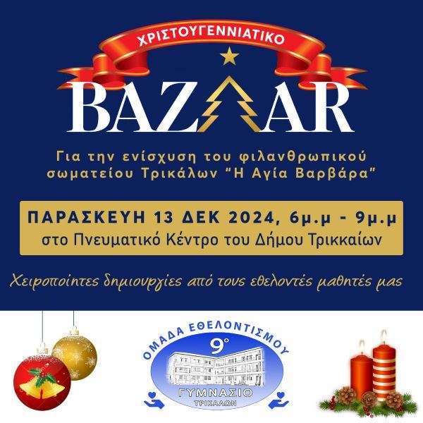 Πρόσκληση στο Χριστουγεννιάτικο Μπαζάρ από το 9o Γυμνάσιο Τρικάλων