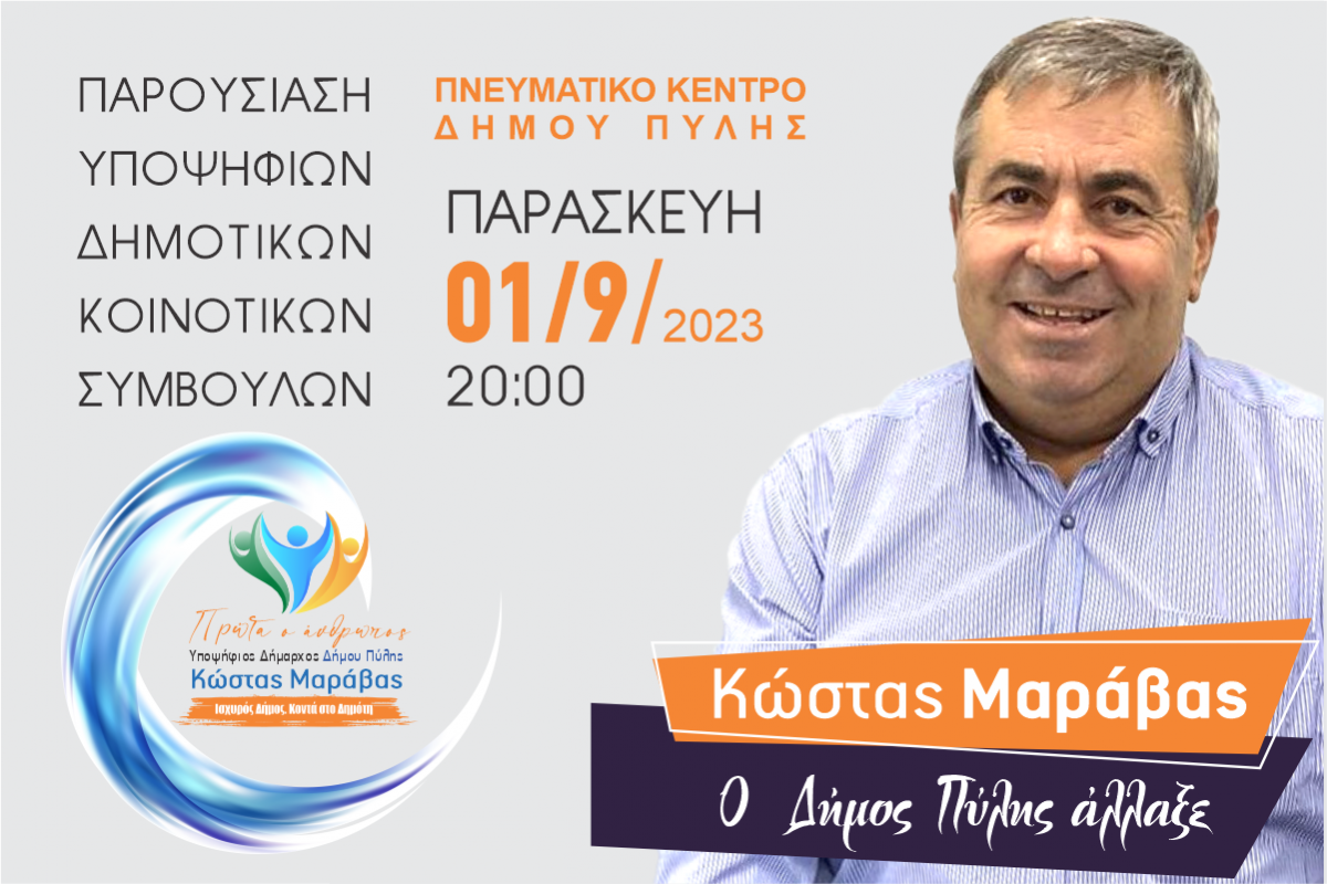 Ο Κωνσταντίνος Μαράβας, Δήμαρχος Πύλης & επικεφαλής του συνδυασμού «Πρώτα ο άνθρωπος», καλεί αποκλειστικά και μόνο όλους τους υποψήφιους Δημοτικούς και Κοινοτικούς Συμβούλους του συνδυασμού, την Παρασκευή 1 Σεπτεμβρίου 2023 και ώρα 20.00 μ.μ. στο Πνευματικό Κέντρο του Δήμου Πύλης, στην έδρα του δήμου.