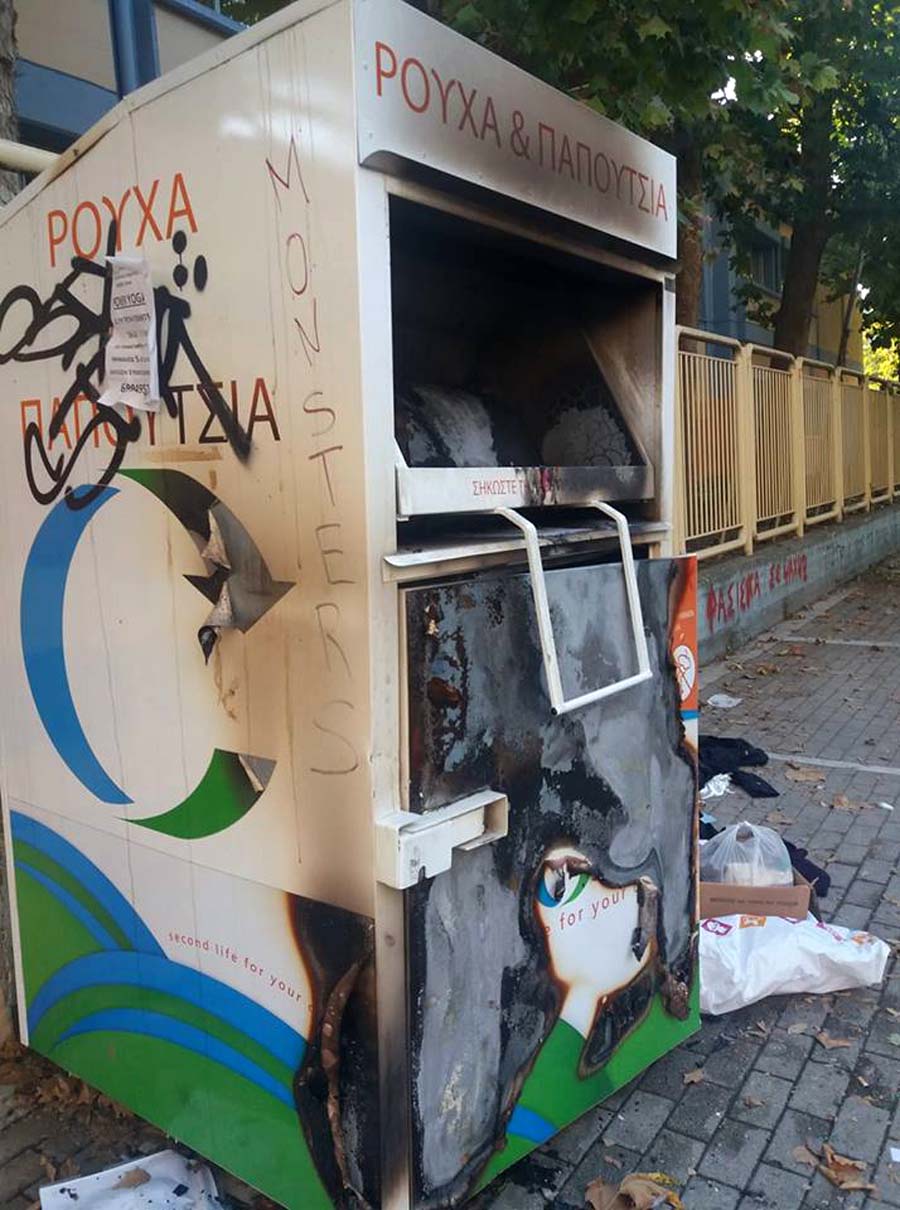 Μετά τα 18 περιστατικά καμμένων κάδων απορριμμάτων σε μόλις μερικές ημέρες, σειρά σήμερα πήρε το σημείο ανακύκλωσης ρούχων στη συμβολή των οδών Τσιμισκή και Ιουστινιανού.