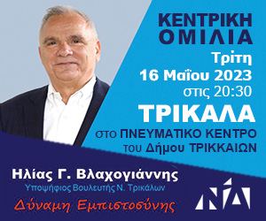 Αύριο βράδυ στις 08.30 μμ,θα πραγματοποιηθεί στο Πνευματικό Κέντρο του Δήμου Τρικκαίων, η Κεντρική προεκλογική συγκέντρωση και ομιλία του πρ. Νομάρχη-Βουλευτή και εκ νέου υποψηφίου της Νέας Δημοκρατίας Ηλία Βλαχογιάννη. Καλούνται οι πολιτικοί φίλοι και φίλες του Ηλία, ως και τα στελέχη της Παράταξης, να τιμήσουν με την παρουσία τους την εκδήλωση.