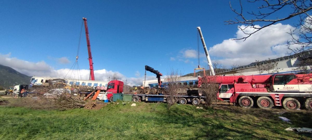 Το βαγόνι φορτώνεται σε νταλίκα προκειμένου να μεταφερθεί σε χώρο του ΟΣΕ στο παλιό εργοστάσιο ζαχάρεως στη Λάρισα, όπου θα πραγματοποιηθεί περαιτέρω έρευνα προκειμένου να εντοπιστούν περισσότερα στοιχεία για τα αίτια που είχαν ως αποτέλεσμα την πολύνεκρη τραγωδία.