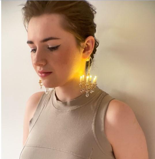 Η νεαρή καλλιτέχνις με έδρα τη Νέα Υόρκη δημιουργεί τα σκουλαρίκια από ορείχαλκο, ασήμι 925, χρυσό 14 καρατίων και γυάλινα κρύσταλλα και προσθέτει λίγη μαγεία με τη μορφή κεριών με LED που ανάβουν χάρη στην ενέργεια που παρέχει μια μικρή μπαταρία κρυμμένη πίσω από το αυτί σας.