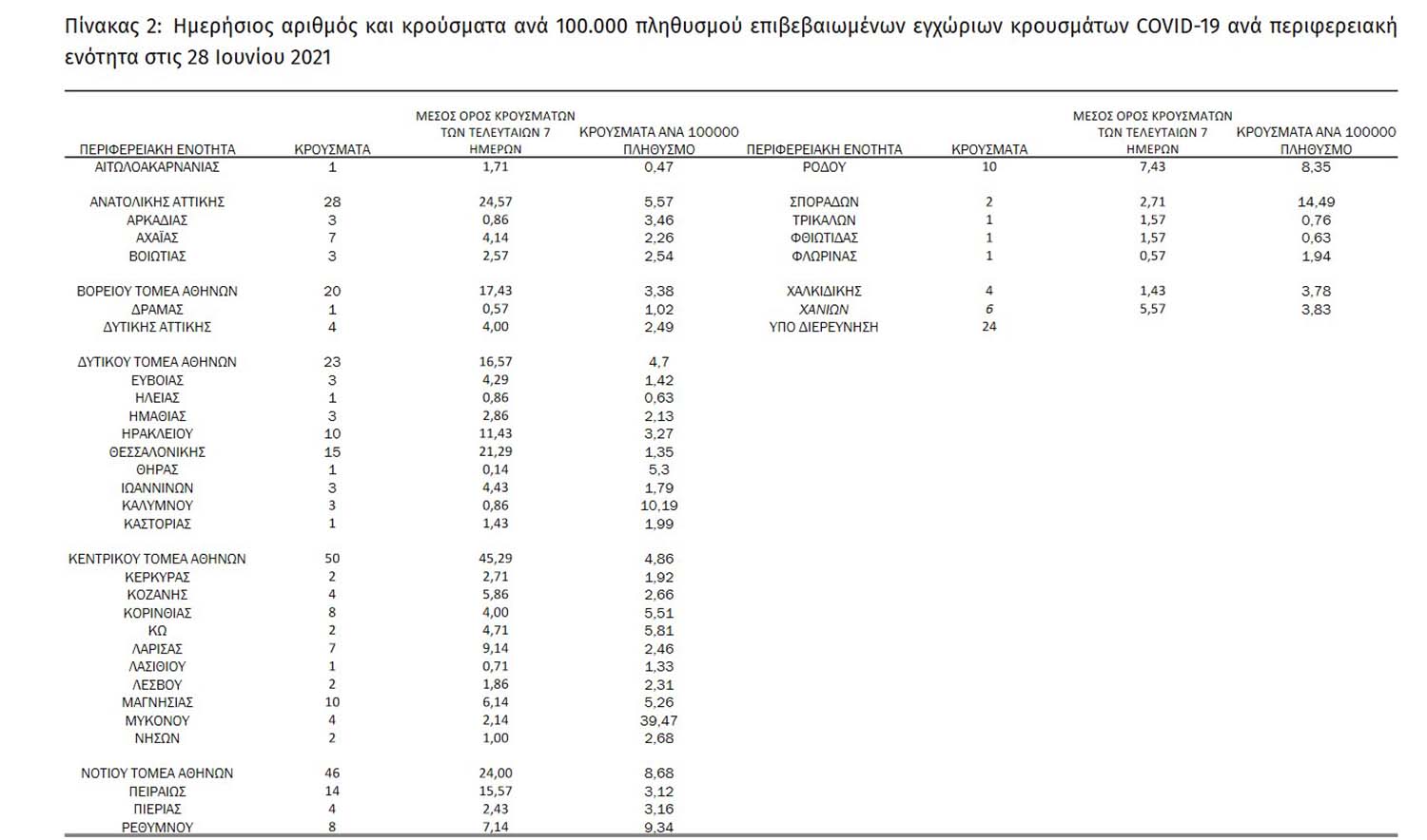 Σε όλη τη χώρα, με βάση τα δεδομένα που έχουν δηλωθεί στον ΕΟΔΥ και καταγραφεί μέχρι τις 28 Ιουνίου 2021 (ώρα 15:00). τα νέα εργαστηριακά επιβεβαιωμένα κρούσματα της νόσου που καταγράφηκαν τις τελευταίες 24 ώρες είναι 362, εκ των οποίων 11 εντοπίστηκαν κατόπιν ελέγχων στις πύλες εισόδου της χώρας.