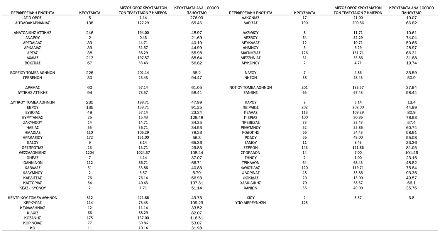 Τα νέα εργαστηριακά επιβεβαιωμένα κρούσματα της νόσου που καταγράφηκαν τις τελευταίες 24 ώρες είναι 6.602 , εκ των οποίων 14 εντοπίστηκαν κατόπιν ελέγχων στις πύλες εισόδου της χώρας. Ο συνολικός αριθμός των κρουσμάτων ανέρχεται σε 914.824 (ημερήσια μεταβολή +0.7%), εκ των οποίων 50.6% άνδρες.
