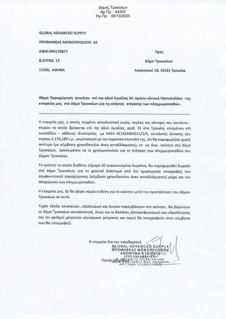 Με επίσημο έγγραφό της προς τον Δήμο Τρικκαίων, η ιδιοκτήτρια εταιρεία του κτίσματος της πρώην κλινικής Παντελιδάκη, γνωστοποιεί ότι του το παραχωρεί, για τις ανάγκες στέγασης των πλημμυροπαθών. Με έγγραφό της στις 6 Οκτωβρίου 2023 η  Global Advanced Supply Προμηθέας μονοπρόσωπη ΑΕ και θέμα «Παραχώρηση ακινήτου επί της οδού Αμαλίας 24 – πρώην κλινική Παντελιδάκη – της εταιρείας μας στον Δήμο Τρικκαίων για τις ανάγκες στέγασης των πλημμυροπαθών», αναφέρει:
