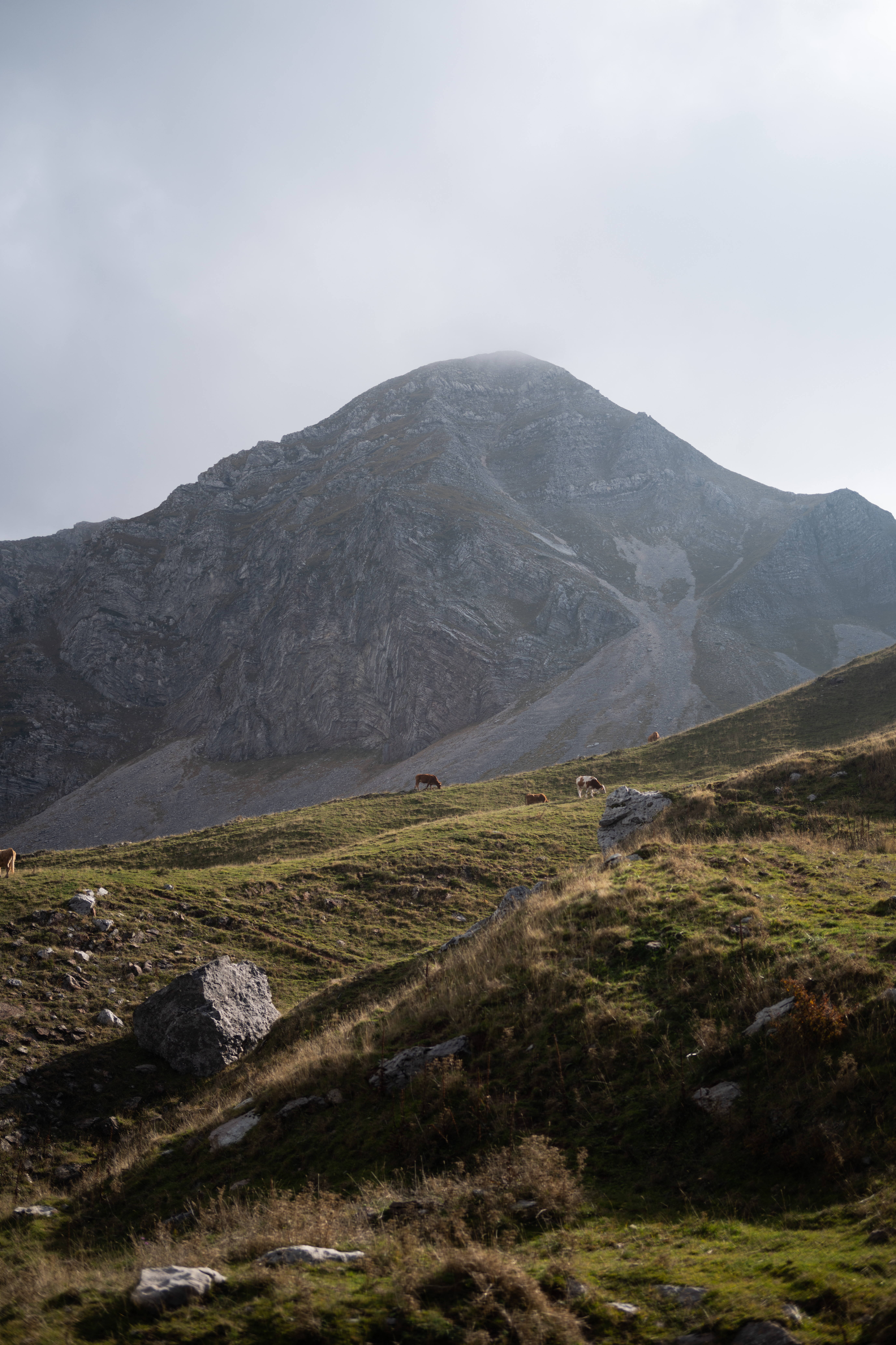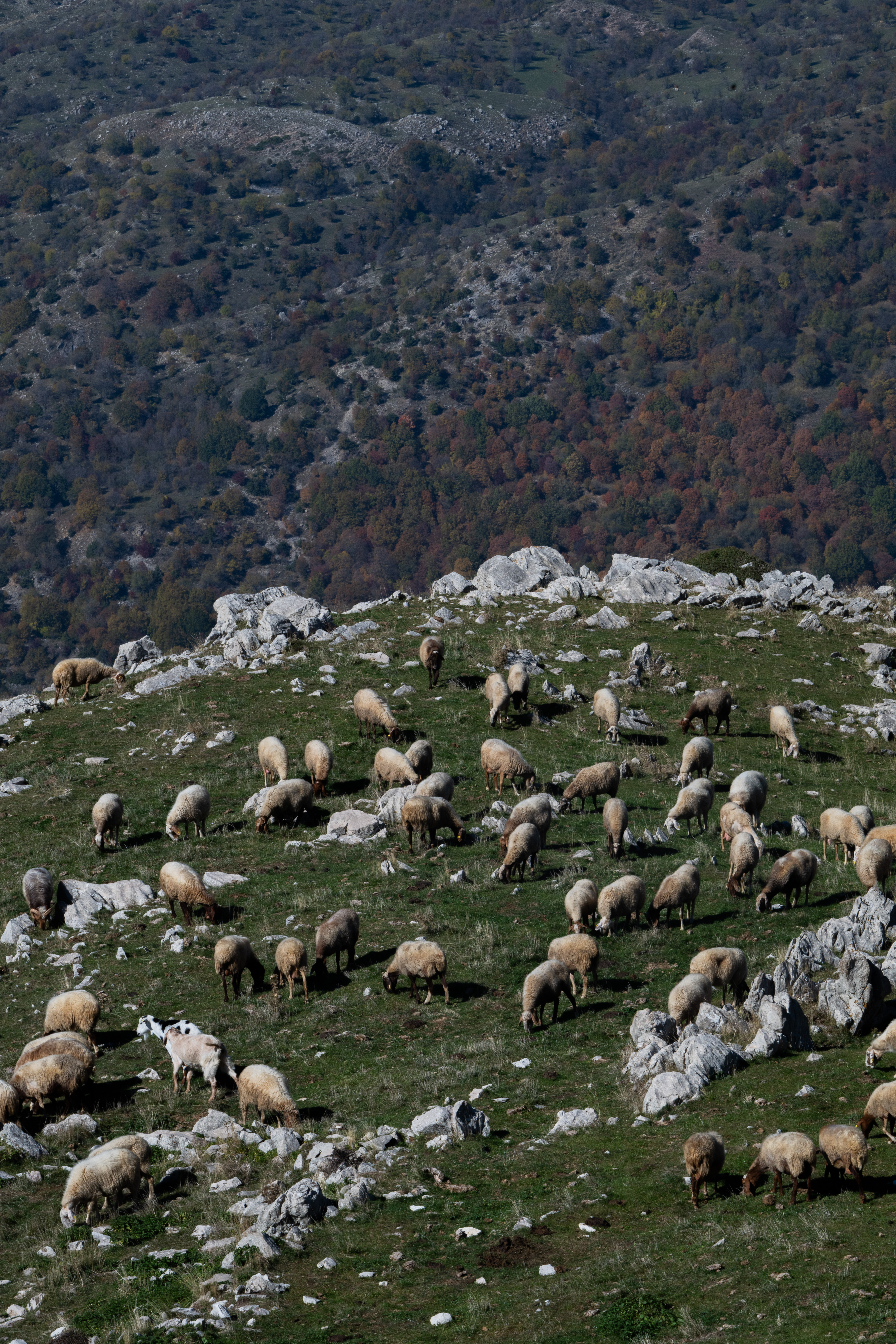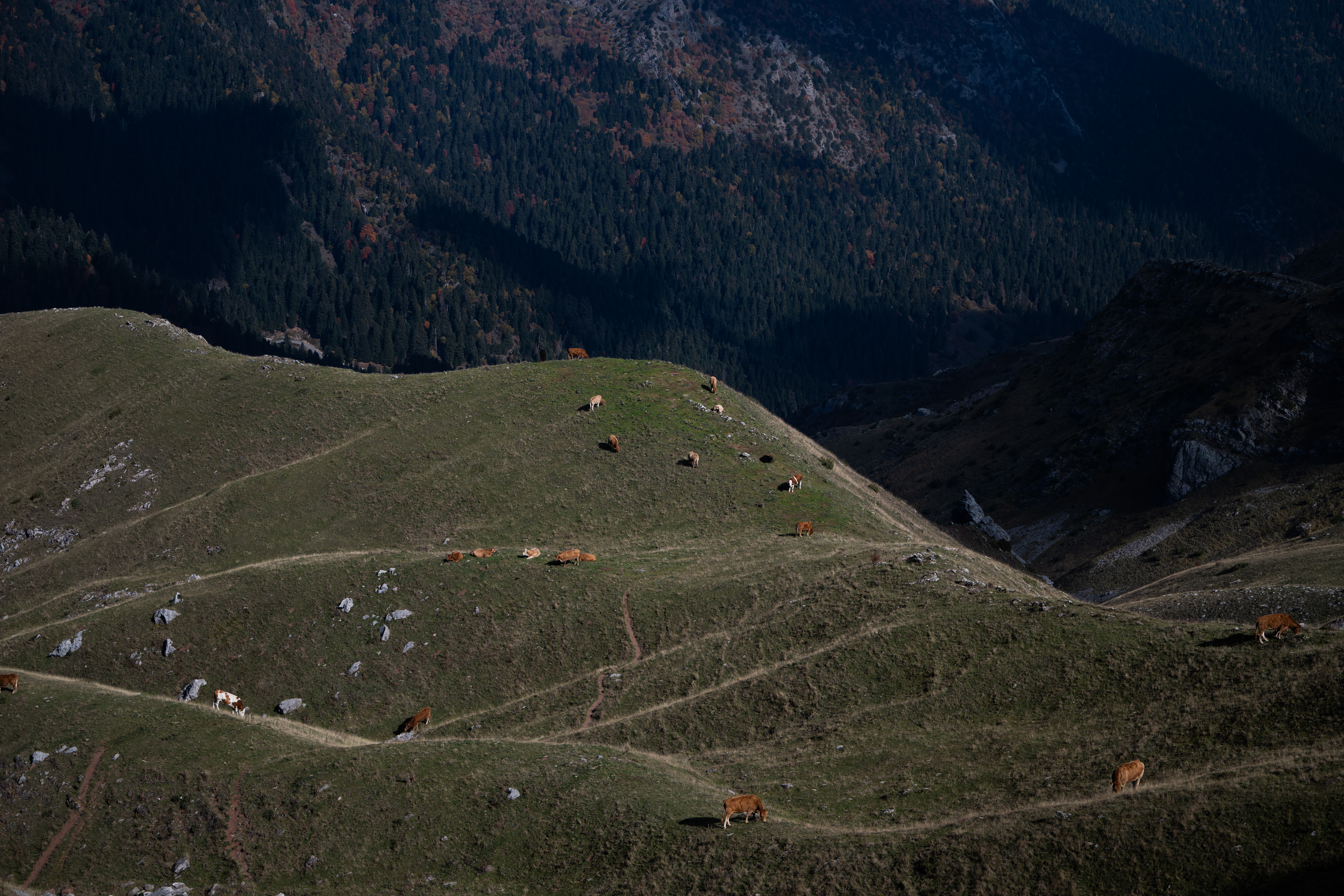 Όσο κερδίζαμε υψόμετρο, το σκηνικό άλλαζε δραματικά. Τα πυκνά δάση έδωσαν τη θέση τους σε αλπικά λιβάδια. Πάνω από τα 1.500 μέτρα, ο αέρας έγινε πιο αραιός και δροσερός. Κοπάδια προβάτων έβοσκαν ελεύθερα στις πλαγιές, συνεχίζοντας μια παράδοση αιώνων, με τα τσοπανόσκυλα να μας παρατηρούν καχύποπτα στο πέρασμά μας.