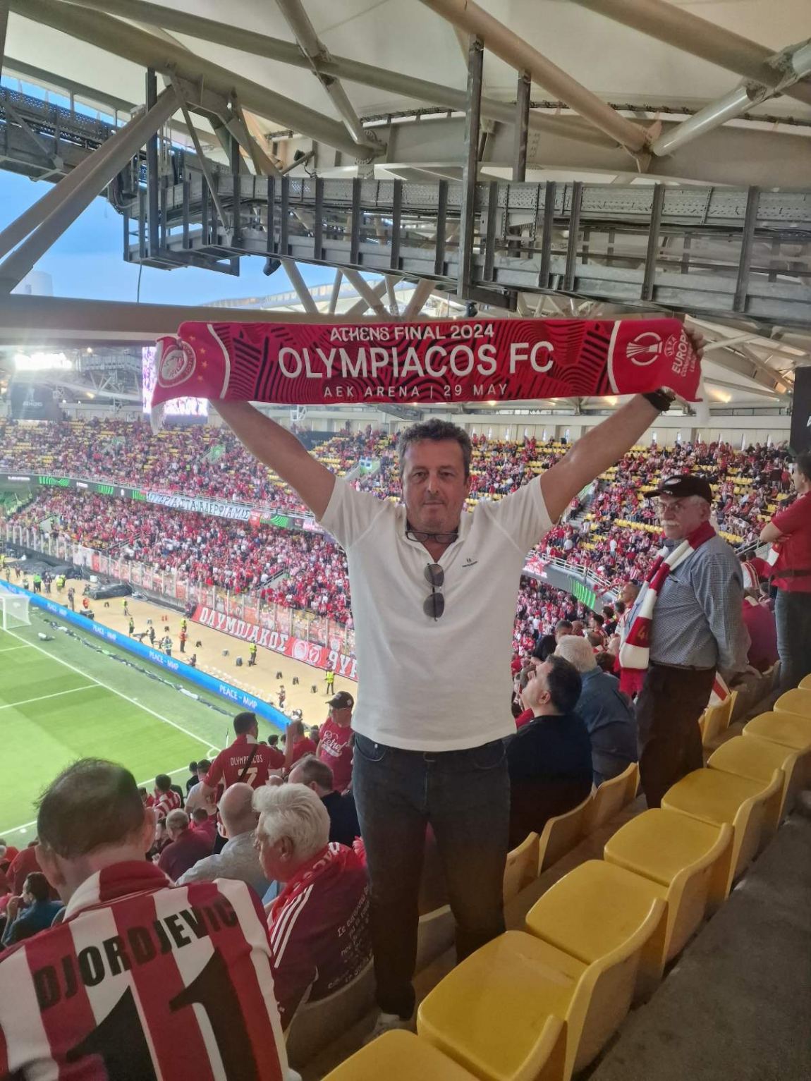 Χιλιάδες οπαδοί του Ολυμπιακού και της Φιορεντίνα έχουν φτάσει στο OPAP Arena φορώντας τα διακριτικά της ομάδας του και κρατώντας το εισιτήριό τους στο χέρι.Στους τυχερούς που θα παρακολουθήσουν το ιστορικό γεγονός ο επιχειρηματίας Αχιλλέας Κουτελίδας ο οποίος από νωρίς έπιασε θέση για να συμμετάσχει σε όλο το τελετουργικό του αγώνα