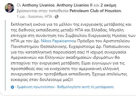 Ευχαριστώ θερμά τον CEO της U.S. Energy Stream καθώς και τον Γενικο Πρόξενο της Ελλάδας στο Τέξας, για την τιμητική πρόσκληση και τη δυνατότητα που είχα να παρουσιάσω σε Energy leaders εταιριών και γενικούς διευθυντές από την Αμερικανική Γερουσία και το Αμερικανικό Κογκρέσο, την καινοτόμα ερευνητική δραστηριότητα του Α.Π.Θ. καθώς και να συζητήσουμε δυνατότητες συνεργασίας σε ερευνητικό επίπεδο. Το Α.Π.Θ. με τα μέλη του ανοίγει αλλη μια πόρτα στο εξελισσομενο παγκόσμιο γίγνεσθαι.